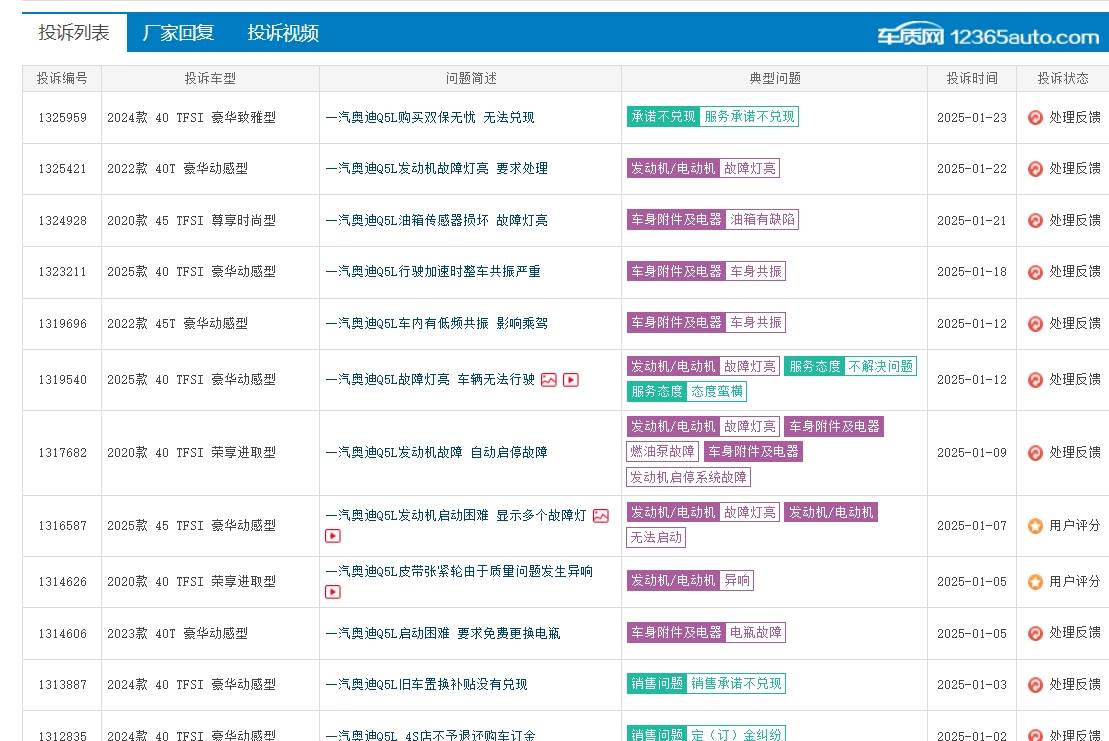 此外,從車質網的投訴來看,包括一汽奧迪A4L、A6L、Q5L等也存在一些投訴,包括發動機故障燈亮、 車身共振等,能否妥善解決車主的投訴,也將在相當程度上影響一汽奧迪的品牌與口碑。