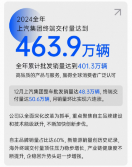 縱觀全年,上汽集團(tuán)累計(jì)整車(chē)終端交付量高達(dá)463.9萬(wàn)輛,保持行業(yè)領(lǐng)先。亮眼的數(shù)據(jù),就是上汽集團(tuán)逆風(fēng)翻盤(pán)最有力的見(jiàn)證 ,彰顯了其深厚的底蘊(yùn)與強(qiáng)大的韌性。那么,上汽集團(tuán)又是如何實(shí)現(xiàn)的?