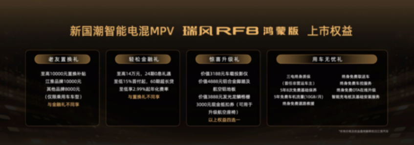 配置全面領先,一步到位標配,誠意滿懷的瑞風RF8鴻蒙版提供了四重驚喜權益,包括1萬元老友置換禮、多金融方案的輕松金融禮、超值選裝套件的驚喜升級禮以及三電終身質保、免費充電樁及基礎安裝等8項超值權益的用車無憂禮。無論在購車福利、售后服務,還是在金融政策上,瑞風RF8鴻蒙版都為用戶提供實實在在的價值,用誠意回饋每一位用戶的信任與支持。