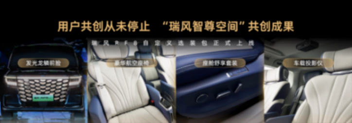 用戶共創不止步,江淮瑞風攜手用戶再度共創,瑞風RF8為滿足用戶個性化需求而上線多種自定義選裝包,包括發光龍鱗前臉、座艙舒享套裝、車載投影儀等,已經正式上架選裝,用戶可以通過江淮瑞風APP自由選擇,打造符合自己個性的“新國潮智能電混MPV”。
