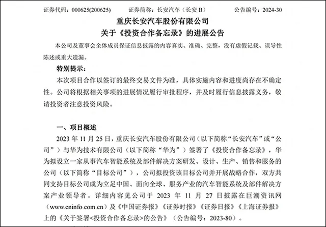 果然,5月6日晚,長安汽車披露了與華為簽訂《投資合作備忘錄》的進展,雙方就合資公司(引望)的財務(wù)、法務(wù)、業(yè)務(wù),基本完成了技術(shù)盡調(diào),雙方預(yù)計不晚于2024年8月31日簽訂最終交易文件。