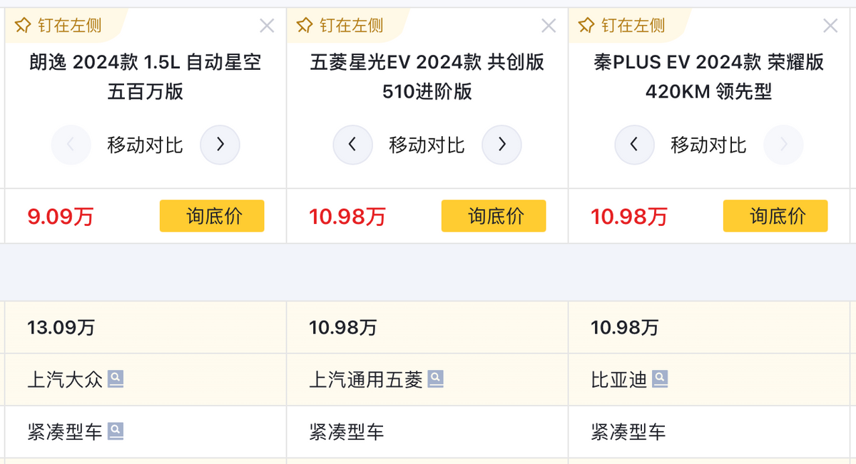 動力和續航方面,我們根據所選車型分開來講,首先是五菱星光EV和比亞迪秦PLUS EV,作為純電車型,前者擁有510公里的續航能力(CLTC),電機功率為204匹馬力,配有快充功能,后者純電續航為420公里(CLTC),電機功率為136匹馬力,同樣配備了快充充電口。再來看看大眾朗逸,這臺車配有1.5L發動機,發動機的最大功率為110匹馬力。最大扭矩為141牛·米,匹配6擋手自一體變速箱。