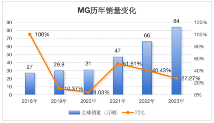 2023年,名爵售出84萬輛,但國內市場僅售出10萬輛左右,占比不到20%,其余的74萬輛,均來自海外市場,實現了反轉。名爵算是海外市場布局比較早的,早在2018年,其海外市場銷量就占比超過25%,在同期的自主品牌中是占比較高的。