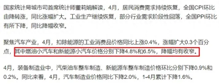 統(tǒng)計(jì)局剛剛公布最新的數(shù)據(jù),傳遞出汽車(chē)價(jià)格反彈的信號(hào)。4月,燃油小汽車(chē)和新能源小汽車(chē)價(jià)格分別下降4.8%和6.5%,降幅均有收窄。從中可以看出,汽車(chē)行業(yè)競(jìng)爭(zhēng)環(huán)境有所好轉(zhuǎn),價(jià)格開(kāi)始修復(fù),價(jià)格戰(zhàn)已階段性趨緩,從近期上市的新車(chē)?yán)镆沧C實(shí)了這點(diǎn)。