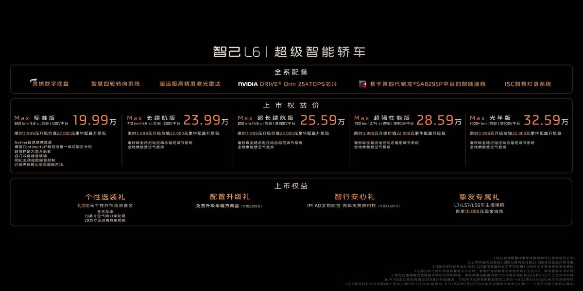 小米都沒做到的“1999”,終于還是讓智己給做到了。5月13日,智己L6正式上市,按照上市權(quán)益抵扣20000元后,智己L6起售價一口氣干到了19.99萬元,比小米SU7低了1.6萬元;而智己L6的非固態(tài)電池的頂配版本為28.59萬元,也比小米SU7的頂配低了1.4萬。