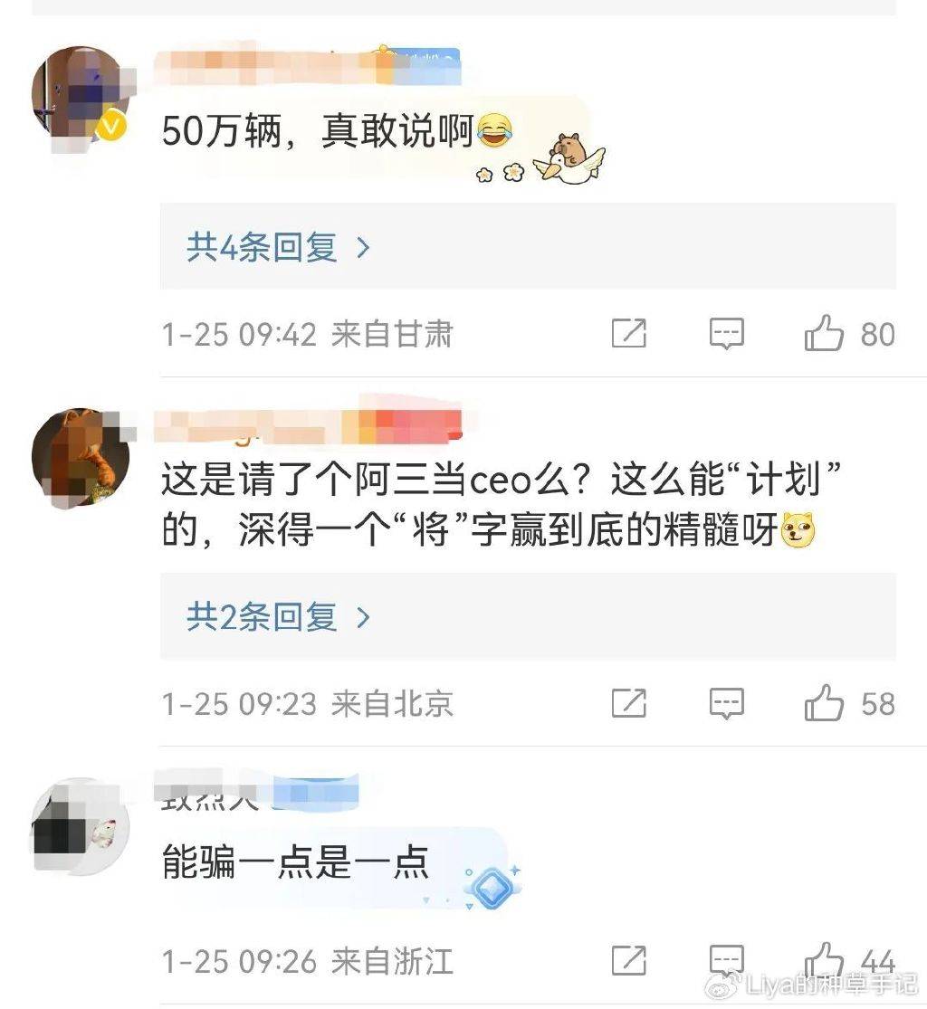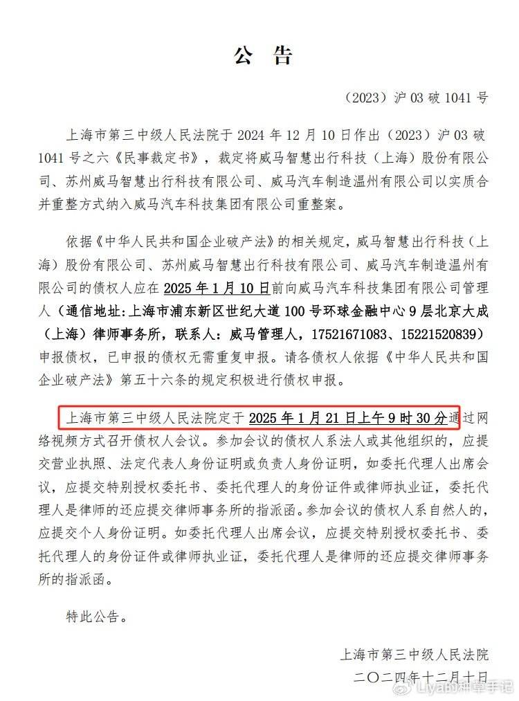 ▲圖源:上海市第三中級人民法院發(fā)布召開威馬汽車債權人會議的公告終于,2025 年 1 月 21 日,有消息傳來:威馬汽車再次召開債權人會議,會議內(nèi)容包括債權核查、管理人工作報告,還有重整計劃的審議表決。這個草案的目標可是相當 “宏偉”:2025 年完成復工復產(chǎn),同時進行品牌煥新和營銷網(wǎng)絡的構建;2026 - 2027 年加大研發(fā)投入,要實現(xiàn)年銷量超過 60 萬輛的目標;2028 - 2029 年向全球投放 10 款新車型,年銷量目標超過 100 萬輛,營收突破 1100 億元,估值達到 1500 億元以上。 要知道,威馬最輝煌的時候,國內(nèi)年銷量也才 4.42 萬輛,現(xiàn)在都破產(chǎn)了,還想著一年賣 100 萬輛,真的不是在做夢嗎?消息一出,便引來網(wǎng)友紛紛吐槽。