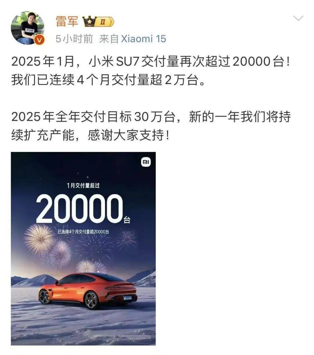 小米汽車宣布,2025年1月,小米SU7交付量再次超過20000臺。目前已連續4個月交付量超2萬,2025年全年交付目標30萬臺。