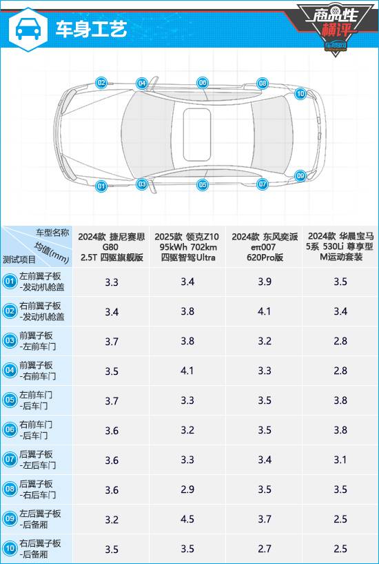 在漆膜水平環節,從測試結果來看,領克Z10表現更加亮眼,整車漆膜平均厚度在測試過的車型中處于中上游水平,同時噴涂均勻性也優于另外三款車。捷尼賽思G80和東風奕派eπ007的漆膜厚度均達到中游水平,前者噴涂均勻性表現稍遜于后者。相比之下,華晨寶馬5系不僅整車漆膜厚度在四款車中墊底,漆膜噴涂均勻性也存在提升空間。