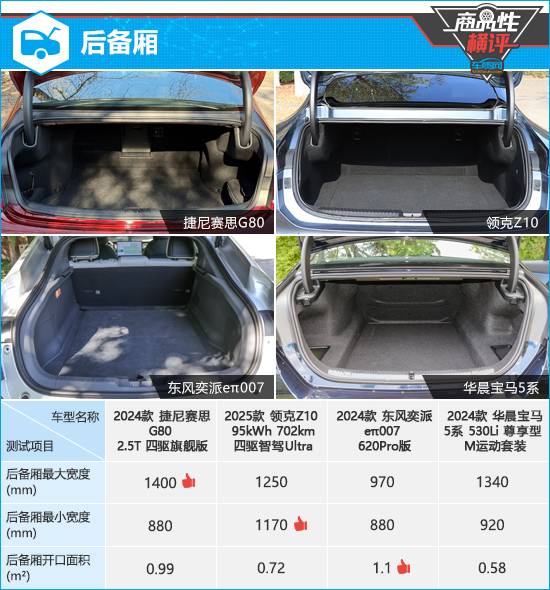 后備廂方面,從實測數據來看,東風奕派eπ007得益于掀背式造型設計,因此開口面積大幅領先于另外三款車,不過最大寬度數值卻處于墊底位置。捷尼賽思G80的后備廂最大寬度達到1400mm,領先于其余三款車,開口面積則僅次于東風奕派eπ007。