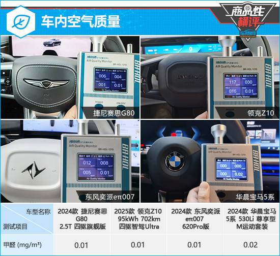 在車內空氣質量測試中,四款車的車內甲醛含量均控制在合理范圍內,符合2012年3月1日起實施的,由原環保部和國家質量監督檢驗檢疫總局聯合發布的《乘用車內空氣質量評價指南》(中華人民共和國國家標準GB/T 27630-2011)中的相關標準。