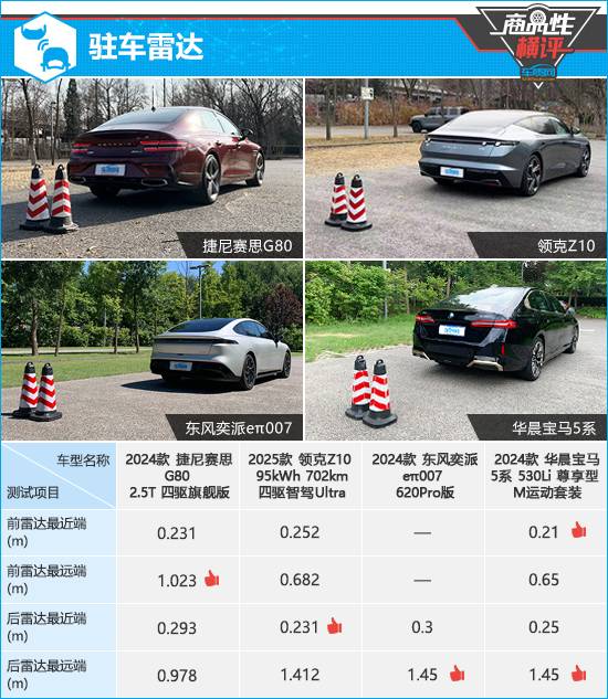 在雷達感應測試中,根據已有測試數據來看,東風奕派eπ007和華晨寶馬5系的后雷達探測能力較強。持續蜂鳴階段提示距離方面,領克Z10表現相對更好,而東風奕派eπ007的后駐車雷達持續蜂鳴提示距離與測試均值相差較大。