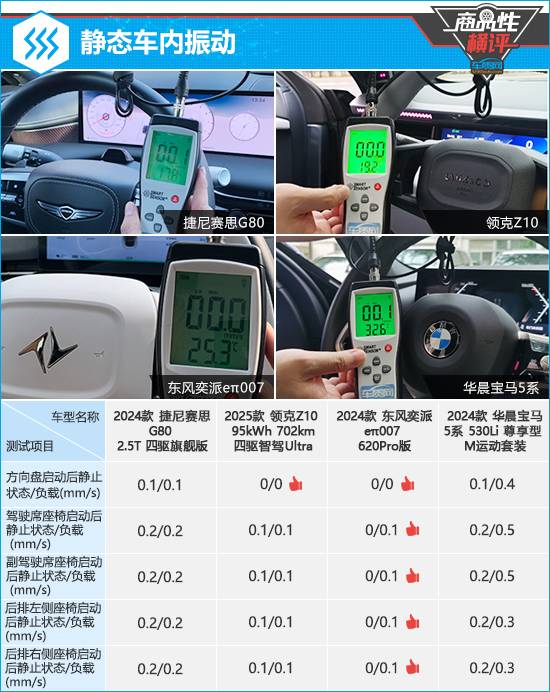 在靜態車內振動測試中,東風奕派eπ007整體表現更好,方向盤位置在兩種狀態下的振動數值始終為0,前后排座椅的振動數值也控制在較低水平。領克Z10成績緊隨東風奕派eπ007之后,整體表現同樣可圈可點。對比之下,捷尼賽思G80和華晨寶馬5系兩款燃油動力車型表現相對遜色,后者在負載狀態下所有測試部位的振動數值明顯升高,體感略微明顯。