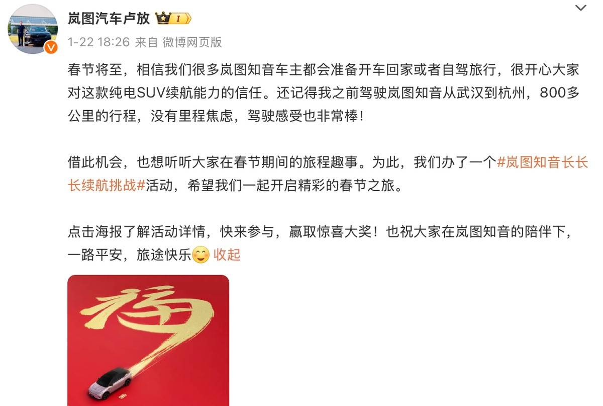 嵐圖知音不僅擁有越級的5C超充,打消用戶的補能焦慮,而且在續航里程上也追求極致,實力拉滿。超長續航智享版擁有901公里的超長續航,在目前的量產純電車型中處于第一梯隊,用戶在滿電狀態下城市通勤的話,輕輕松松實現“一月一充”。春節前夕,嵐圖汽車CEO盧放還在微博發起“嵐圖知音長長長續航挑戰”活動,邀請嵐圖知音車主參與其中。