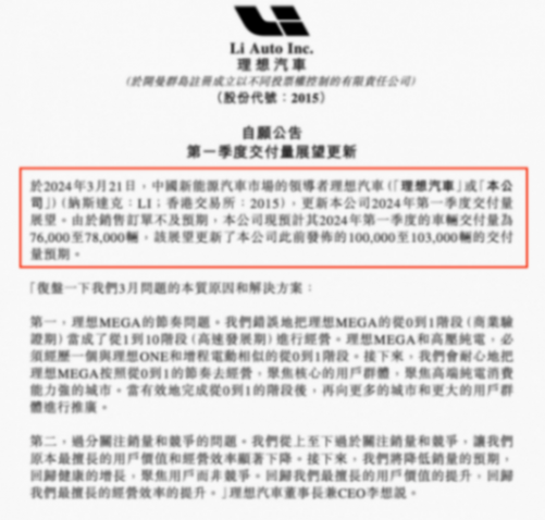 在這一勢頭下,理想汽車風(fēng)光無兩。然而,轉(zhuǎn)折卻也猝不及防。今年3月份,理想汽車首款純電車型MEGA上市即引發(fā)了較大的輿論爭議。由于訂單不及預(yù)期,理想汽車不僅市值不到一個月,即蒸發(fā)了上百億元,而且還放棄了沖刺80萬輛的全年銷量目標(biāo),全年目標(biāo)調(diào)整為56-64萬輛。