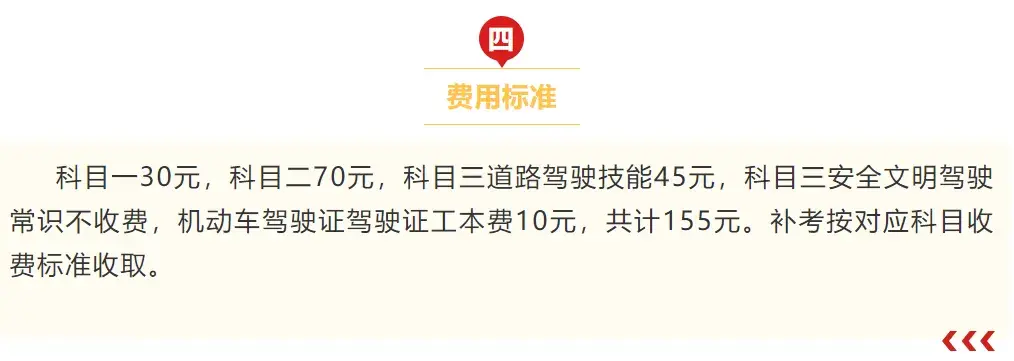 關(guān)于收費這方面,其實各地標準并不統(tǒng)一,不過金額相差也不會太多,以江蘇丹陽為例,四項考試加上駕駛證工本費,一共在155元,補考按照對應科目的收費標準收取。