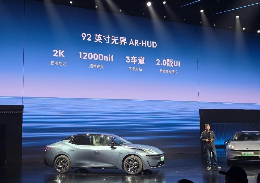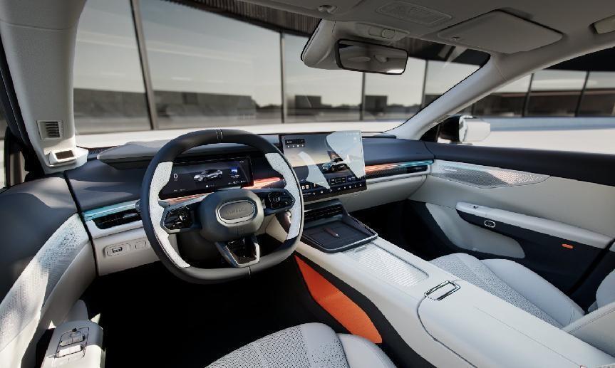內飾部分有很多元素與領克08 EM-P類似,平鋪式的中控臺面和貫穿式空調出風口,上方配備12.3英寸全液晶儀表盤和15.4英寸懸浮式中控屏幕,搭配92英寸AR-HUD抬頭顯示,組成三屏系統。LYNK Flyme Auto魅族車機系統也沒有落下,UI界面簡潔自然,交互邏輯清晰易懂。
