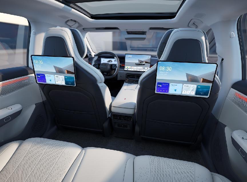 多功能方向盤采用三輻式平底構造,中間帶有橢圓形金屬裝飾,顯得更加前衛。電子懷擋換擋為扶手箱讓出更多空間,提供手機無線充電板和帶有蓋板的雙杯架。另外,該車的座椅A面采用了Nappa真皮包裹,四個座椅均支持加熱、按摩、通風等,前排座椅靠背還帶有Flyme Link功能,支持拓展連接Co Pad,具備控車、娛樂、看護等功能。