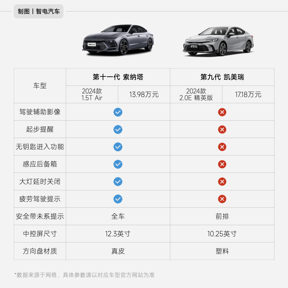 以入門車型對比為例,第十一代索納塔在配置層面遠豐富于價格更高的第九代凱美瑞,駕駛輔助影像、起步提醒、無鑰匙進入功能、大燈延時關閉等實用性配置,17萬的凱美瑞沒給到的,13萬的索納塔全部到位。