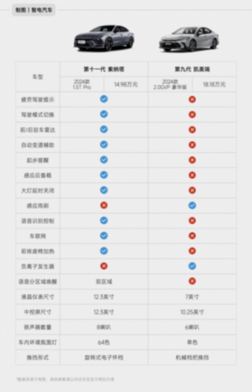 當然,更多消費者購車還是會盡量選擇中高配車型,我們不妨拿第十一代索納塔1.5T Pro和第九代凱美瑞2.0GVP豪華版對比:無論是前后駐車雷達、起步提醒、車聯網、語音識別控制等智能科技配置,還是前排座椅加熱、揚聲器數量、車內環境氛圍燈等舒適性感官體驗配置,第九代凱美瑞缺失的,第十一代索納塔都一應俱全,價值感孰優孰劣一目了然。