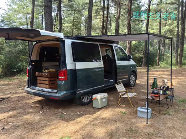 自駕游累了,找到一處空地停下車,展開側邊帳,搬出簡易桌椅和廚具準備野炊。