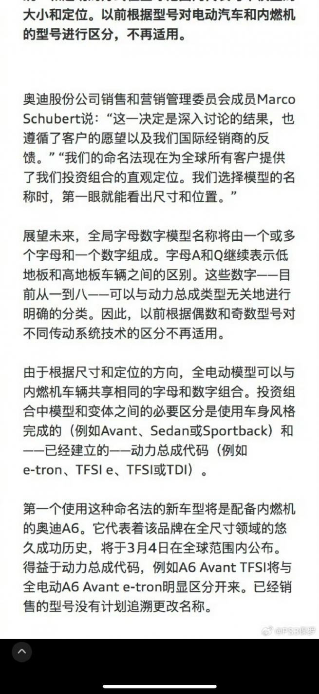 于是,奧迪聽取了經銷商和客戶的意見后,決定放棄新命名規則,回歸傳統。從 3 月 4 號登場的新一代 A6 開始,旗下車型又要重回老的命名策略了。首字母還是老樣子,A 代表轎車,Q 代表 SUV;數字用來區分車身尺寸大小,像 A6 就比 A4 大;后綴則用來表明車輛的燃料形式,TFSI 代表純燃油車,TFSIe 是插電混動,TDI 是柴油車,e-tron 是純電車。比如在奧迪 A6 車系里,汽油版就是 “A6 TFSI”,柴油版是 “A6 TDI”,純電版則是 “A6 e-tron” 。