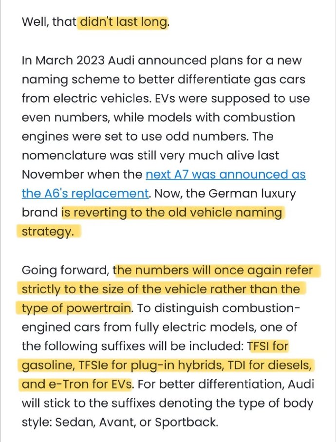 這一番折騰下來,最尷尬的就是 A4 和 A5 了。新一代奧迪 A4 的官圖都發布了,還改成了 A5,現在又要改回去,之前投入的宣傳資源,尤其是著重宣傳更名 A5 的那些,基本都白費了。