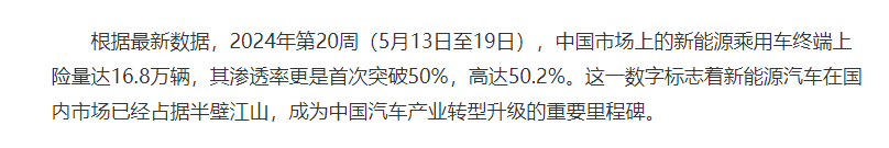 按照乘聯會公布數據,2024年4月上半月,國內新能源車零售滲透率突破50%,而本次5月第三周國內新能源乘用車上險量達到16.8萬輛,新能源終端上險滲透率也首次超過50%。這意味著新能源車型從此刻開始已經有了超越燃油車型的市場份額,算無異于是重大突破,而這項新歷史是由比亞迪和眾多新能源先行企業,以及諸多新能源用戶一起實現。