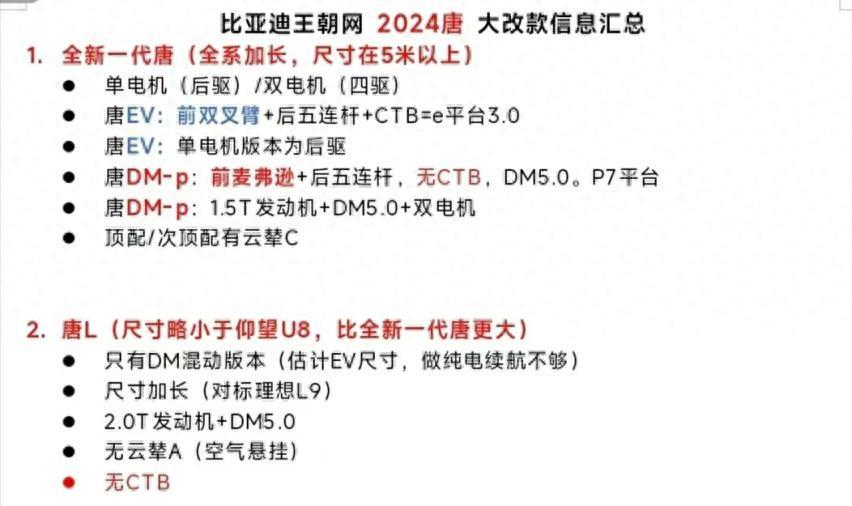 近日,我們從相關渠道獲取到了一組疑似全新比亞迪唐插混的諜照。其實此前網上就已經有了比亞迪唐系列新車規劃信息(可以看下圖),新車除了會搭載全新的DM5.0插混動力外,其尺寸還將超過5米,但DM-p系列并沒有CTB技術。另外,新款依舊會提供EV版本。當然,關于具體的配置,還是要等官方信息。