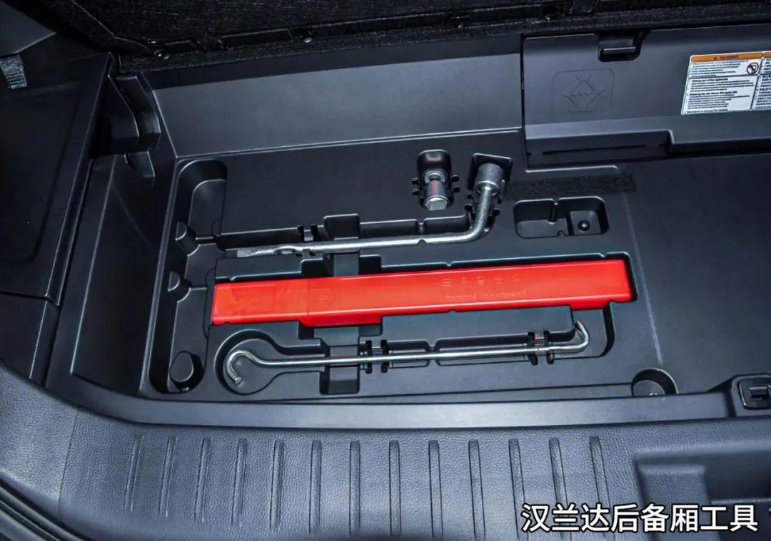 漢蘭達后備廂蓋板下的儲物空間只有一套塞得滿滿的隨車工具,總體實用性不如探陸。