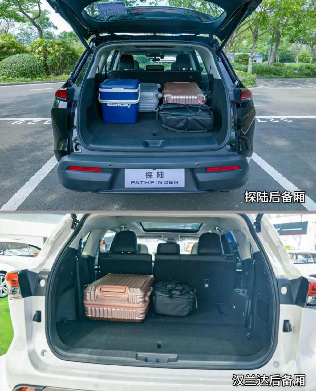 后備廂空間方面,在同樣立起第三排座椅后,漢蘭達與探陸的后備廂空間寬度不相上下,但探陸車身長度更長,所以其進深也稍長一點。