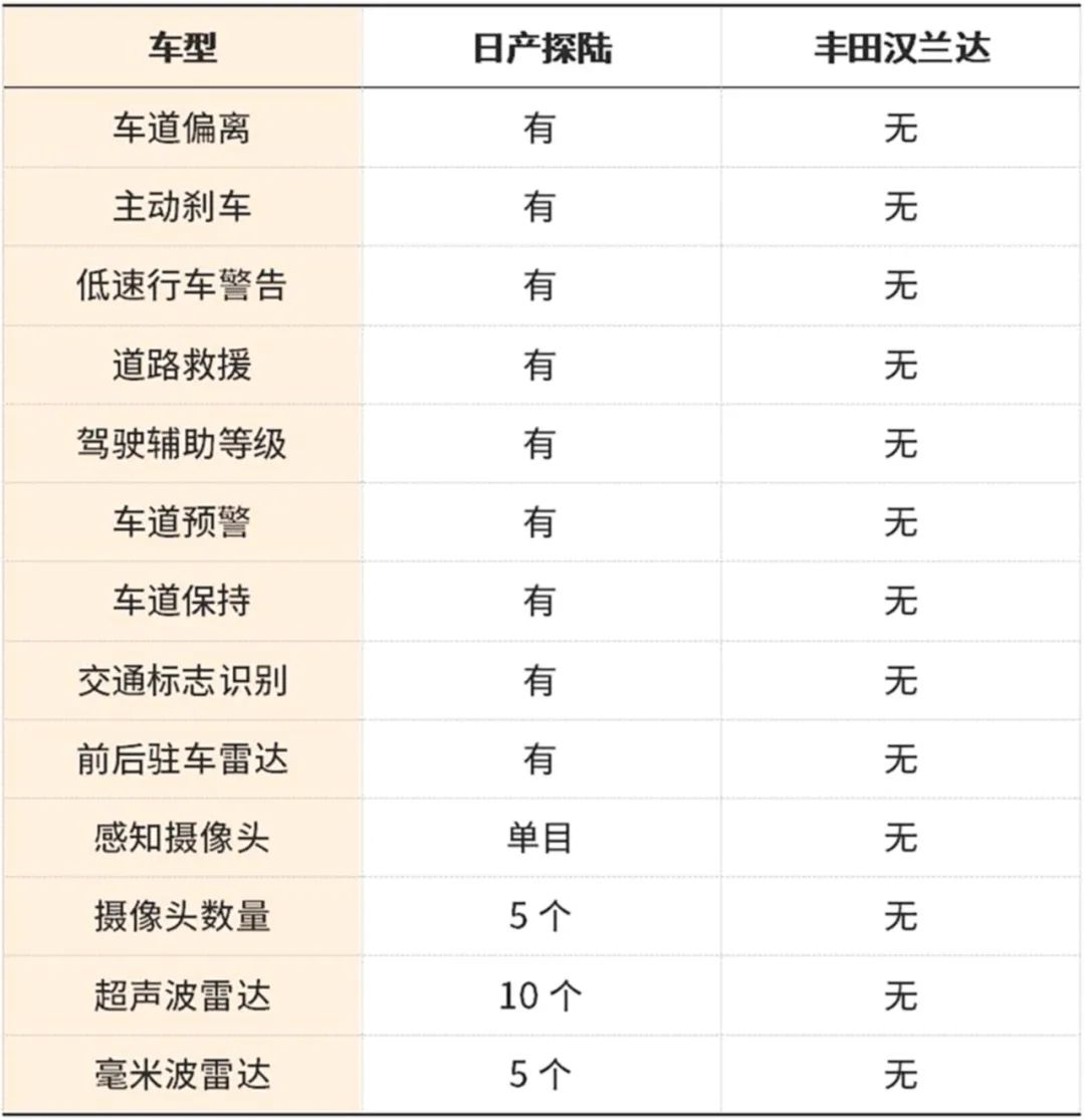 主動安全層面,探陸配備增強版ProPILOT 超智駕,漢蘭達只有30萬以上的車型才配備Toyota Safety Sense駕駛輔助系統,本次對比的車型連前后駐車雷達都沒有。即便配有駕駛輔助的漢蘭達,在功能上也遠不及探陸,探陸的主動安全功能達16項。