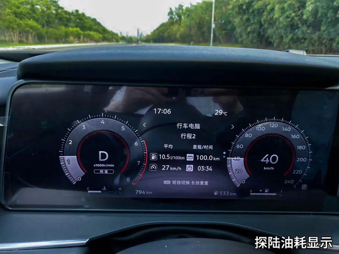 油耗方面,實測探陸百公里城市綜合油耗為10.5L。對一輛車長超5.1米,自重2噸多的中大型SUV來說,這個油耗真不高。