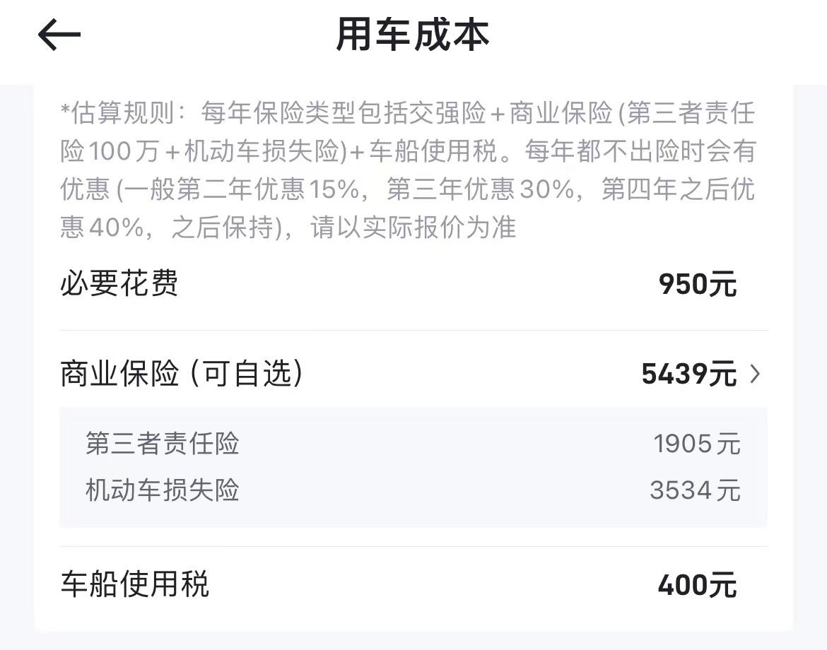 商業(yè)保險:5439元(其中第三方責任險按100萬元的賠付計算,費用為1905元、車輛損失險3534元,賠付額度可以根據(jù)自己的需求選擇。)