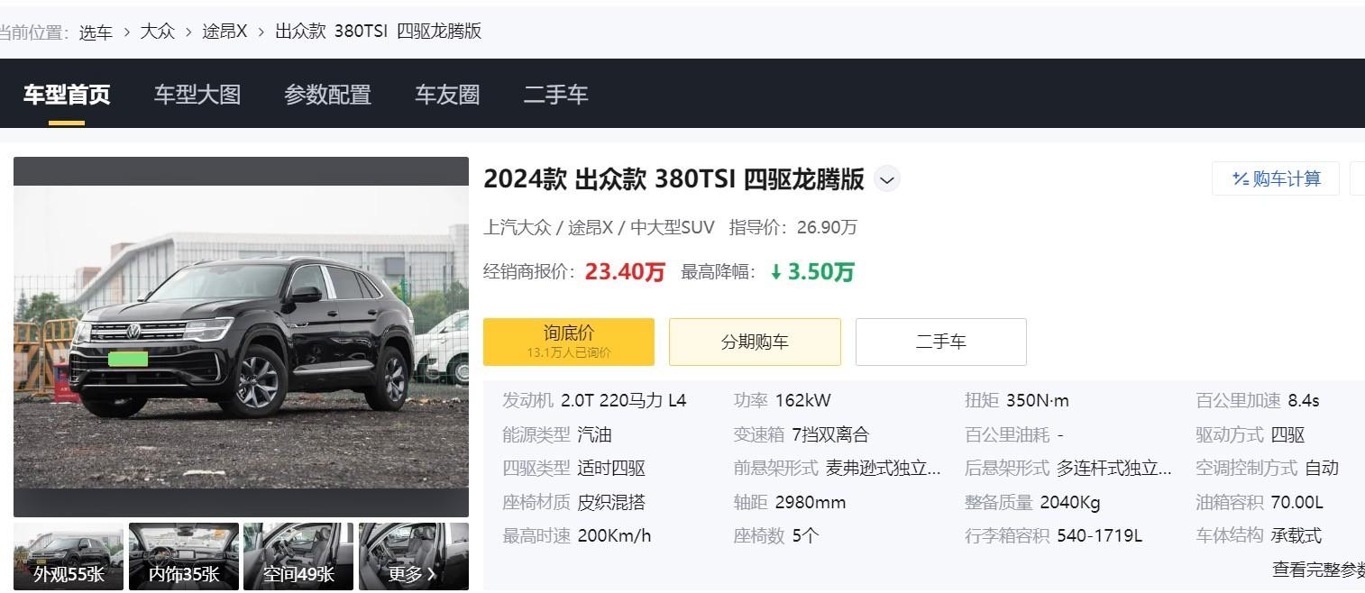 最后,簡要介紹下該車的外觀設計。途昂X的前臉采用了和途昂一樣的外觀設計風格,高聳、寬厚,看上去比較豪放。作為一款中大型SUV,其軸距達到了2980mm,車內(nèi)的空間還是比較寬敞的。配備了前方碰撞預警、主動剎車、全速自適應巡航、自動泊車入位、真皮多功能方向盤、10.25英寸全液晶儀表盤、12英寸中控屏,并支持Hicar、CarPlay和CarLife手機互聯(lián)、語音識別控制系統(tǒng)及OTA升級等功能,提供了極為舒適的駕駛體驗。動力方面,搭載220馬力+7擋雙離合,匹配適時四驅,動力輸出平順,駕駛感受極佳。總體而言,途昂X 2024款 出眾款 380TSI 四驅龍騰版無疑是一款高品質(zhì)的家用車型,非常值得推薦。