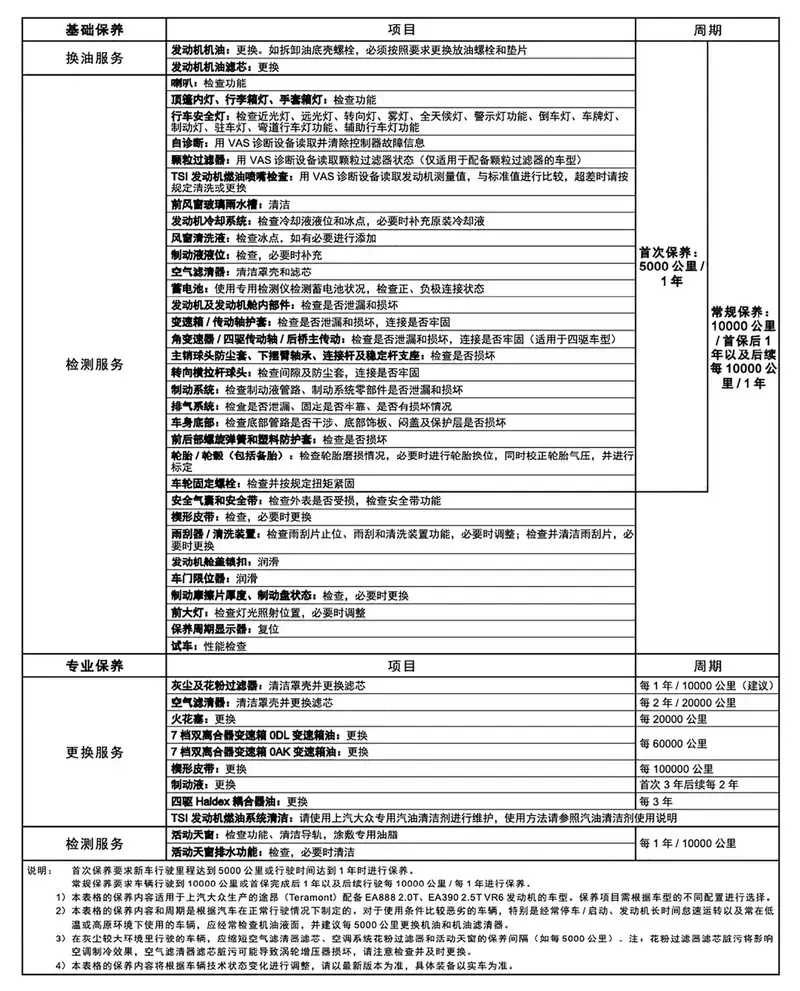 根據(jù)保養(yǎng)手冊,車輛的首保里程為5000km,建議保養(yǎng)間隔為10000公里或12個月(以先到者為準)。途昂X的首次和二次保養(yǎng)僅需要更換機油、機油濾清器,同時還會有多達數(shù)十項的全車檢測和清潔項目,而像變速箱油、皮帶、以及制動液這些配件基本上在60000公里內(nèi)都不需要更換,四驅系統(tǒng)的油液也是每3年才更換一回,可以說相當省心了。我們大致算了一下,65000公里的總保養(yǎng)費用價格是13258元。在同級別陣營里,途昂X的保養(yǎng)費用還是相對親民的,且保養(yǎng)周期較長。