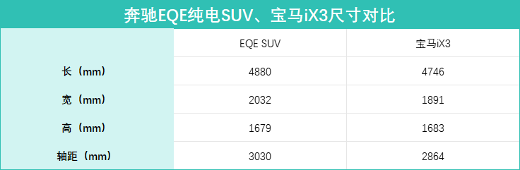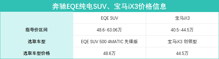 先來回顧一下兩臺車的基礎信息,EQE SUV共推出了3款車型,分別為EQE SUV 500 4MATIC 先鋒版、EQE SUV 500 4MATIC 豪華版、EQE SUV 500 4MATIC 旗艦版,三款車型的指導價分別為48.6萬、51萬、63.06萬,該車定位為中大型SUV;寶馬iX3共推出了2款車型,分別為領先型、創(chuàng)領型,二者的指導價分別為40.5萬、44.5萬,該車定位為中型SUV。整體來看,EQE SUV和寶馬iX3雖然定位有差異,但價格還是蠻接近,大家可能也會在兩款車型之間糾結(jié)。