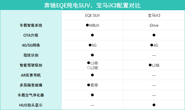 其次,智能駕駛方面,EQE SUV標配了L1級智駕系統(tǒng),可實現(xiàn)全速自適應巡航功能,而寶馬iX3標配了L2級智駕系統(tǒng),其多出了車道保持輔助、自動變道輔助等功能。同時,EQE SUV還配備了盲點輔助功能,以及實時越野路面影像功能,寶馬iX3也配備了并線輔助功能、360°全景影像。細節(jié)配置方面,EQE SUV多出了電動方向盤調(diào)節(jié)、AR實景導航、前排隔音玻璃、數(shù)字鑰匙、車載空氣凈化器等配置,寶馬iX3則多出了循跡倒車、HUD抬頭顯示等功能。整體來看,EQE SUV和寶馬iX3的配置都很豐富,且二者的表現(xiàn)勢均力敵。