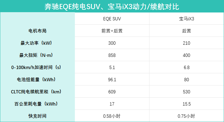 動力及續(xù)航層面,作為高端產(chǎn)品,咱們自然也要提出更高的要求,這一環(huán)節(jié),咱們也來看看EQE SUV和寶馬iX3動力系統(tǒng)的差異。從動力結(jié)構(gòu)來看,EQE SUV標配了前、后雙電機,其最大功率達到300kW,最大扭則達到858N·m,并且整車可實現(xiàn)5.1秒破百,動力還是很強勁,配合4MATIC四驅(qū)系統(tǒng),起步時也基本不會打滑,還是比較好駕馭。寶馬iX3配備了一臺后置驅(qū)動電機,其最大功率為210kW,最大扭矩為400N·m,整車可實現(xiàn)6.8秒破百,作為后驅(qū)車,其能提供一些駕駛樂趣,但面對雨雪天氣,可能不如四驅(qū)車從容。