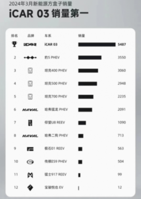 難怪,奇瑞iCAR03在 3月份新能源方盒子車型中銷量成績(jī)排名第一。