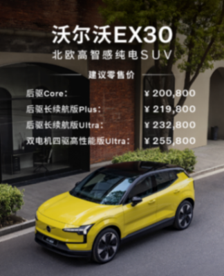 5月19日,沃爾沃在純電動車領域又帶來了一款重磅車型,EX30正式上市,售價區間為20.08萬元-25.58萬元,定位小型純電 SUV,基于 SEA 浩瀚平臺打造。