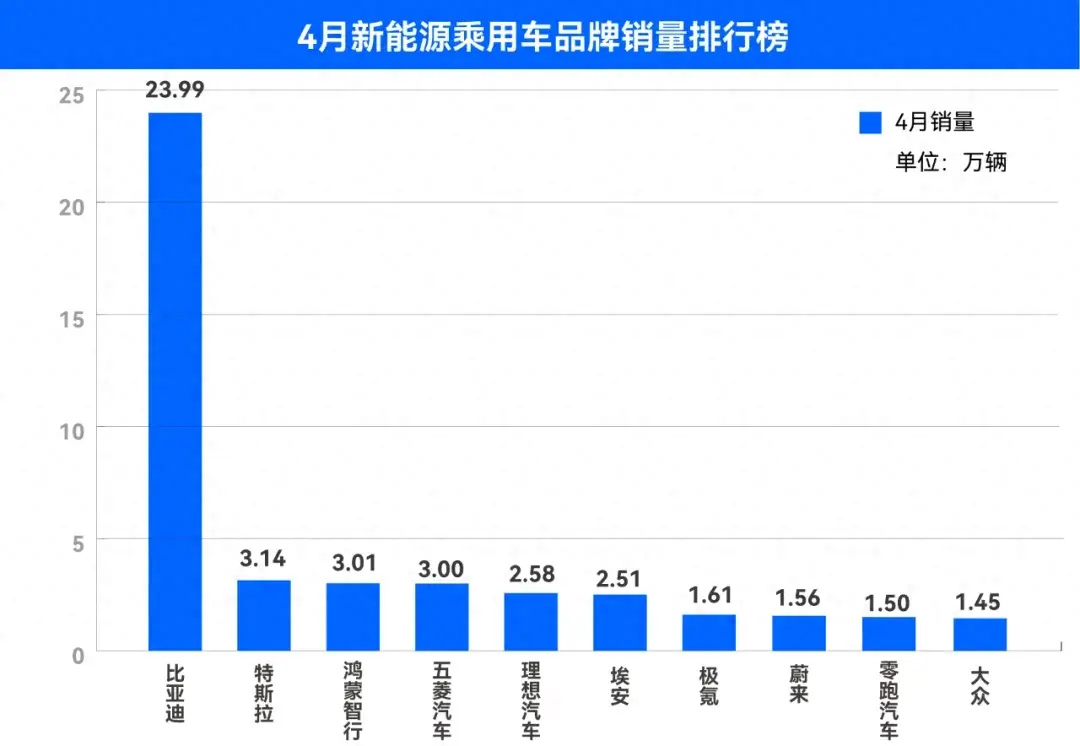 4月份,新能源汽車的銷量不如預期。多個品牌在價格戰的攻勢下不增反減,降價帶來的增量影響明顯減弱,頭部車企里面強如特斯拉也在大幅下降。而鴻蒙智行集體作戰,位列第三,與特斯拉的銷量相當接近。