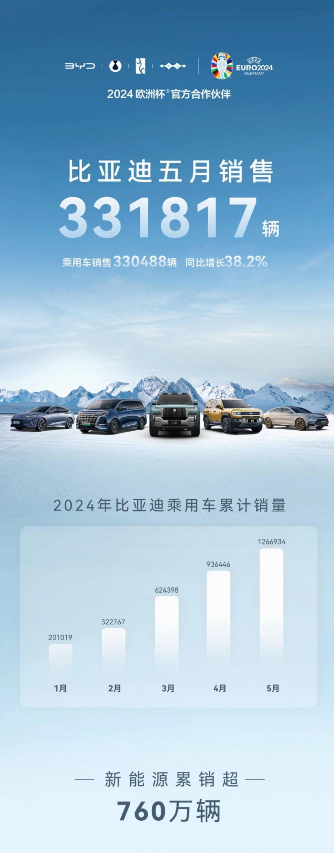頂流一哥比亞迪繼續穩固全球最大的新能源汽車廠商地位,5月份旗下四大品牌比亞迪、騰勢、方程豹、仰望總銷量為331817輛,同比增長38.2%。