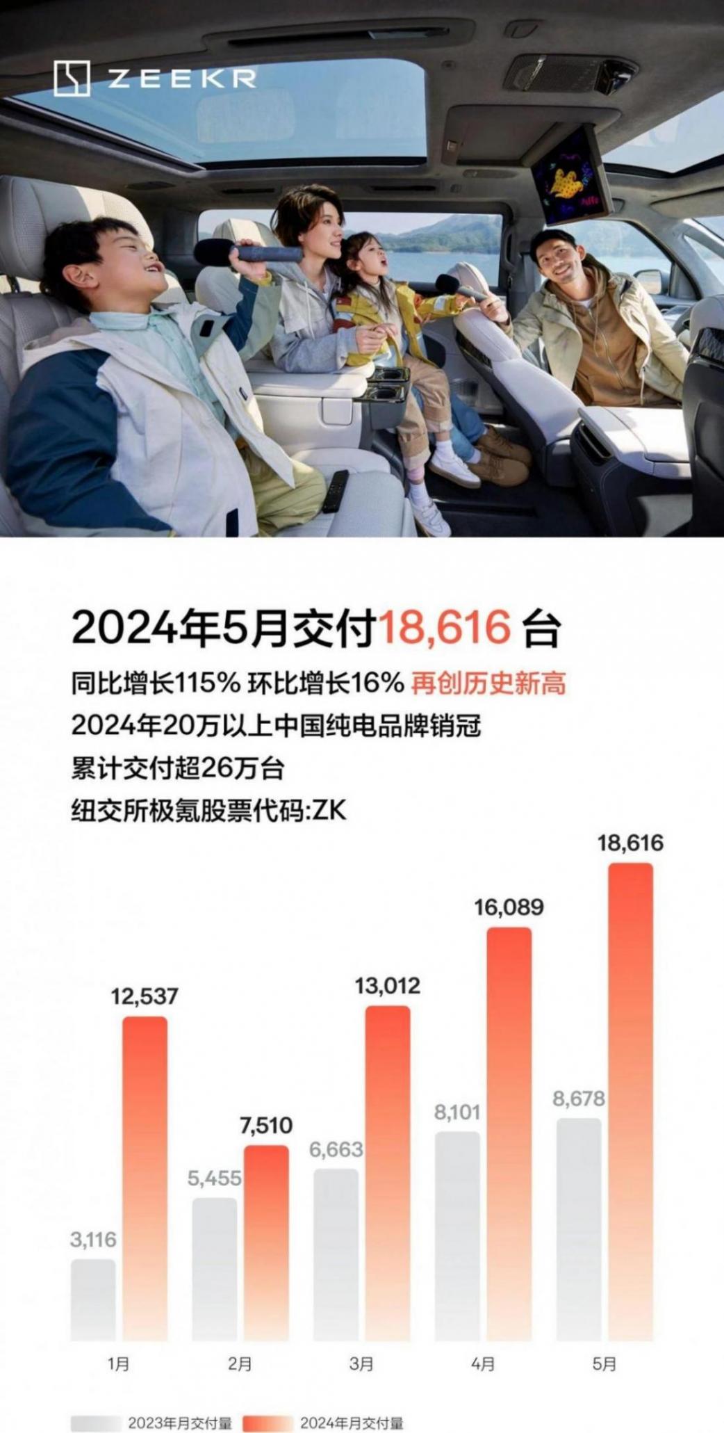 極氪母公司為大吉利汽車集團,作為大吉利面向市場推出的中高端純電品牌,極氪混得一直很不錯。5月交付18,616臺,同比增長115%,環比增長16%。