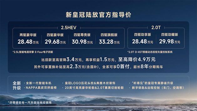 2024年5月30日,一汽豐田新款皇冠陸放上市,售價區(qū)間為28.48萬-33.28萬元。此價格比舊款車型最高降4.9萬元,其中,官方最高降幅3.4萬元,另外可再享權(quán)益1.5萬元。同時,可享含國補(bǔ)至高2.3萬元置換補(bǔ)貼及0首付至高8年分期購車等多重政策。