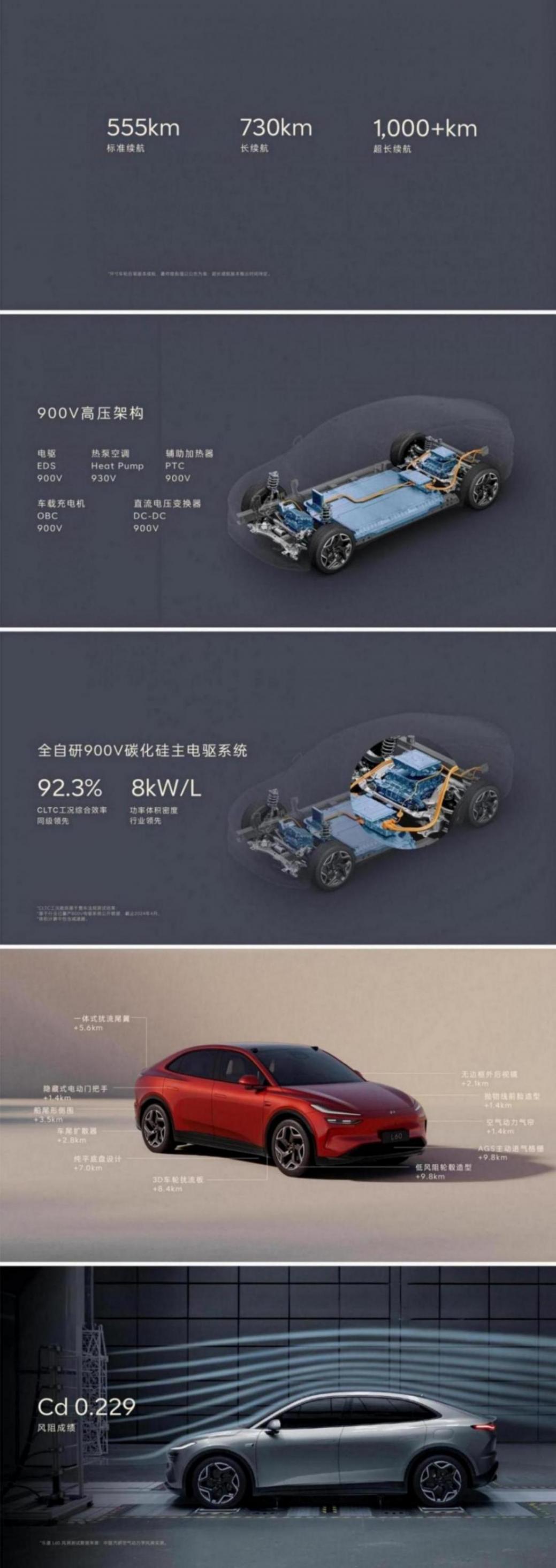 新車采用了900V碳化硅高壓平臺打造,充電效率相比800V高壓平臺有了很大提升,并搭載了75kWh、100kWh和150kWh的電池組,所對應的CLTC續航里程分別為555km、730km和1000+km。當然,新車也支持換電,并和蔚來共享換電站。
