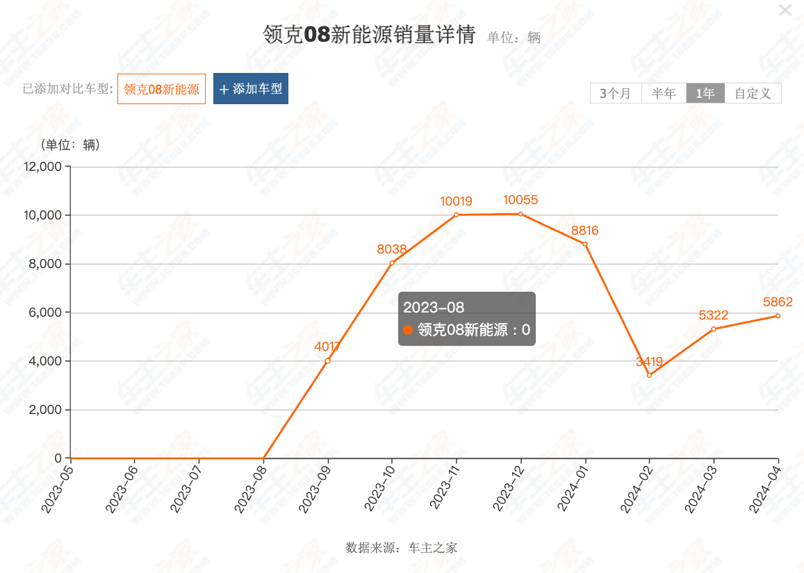 而被寄予厚望,領(lǐng)克品牌沖擊新能源領(lǐng)域的拳頭車型,連續(xù)兩個(gè)月銷量超過1萬臺(tái)的領(lǐng)克08新能源,也在進(jìn)入2024年后銷量回落到5000左右的水平,2024年4月份月銷僅5862臺(tái),雖然還維持在水準(zhǔn)之上,但與高峰期相比也回落了超過4成。