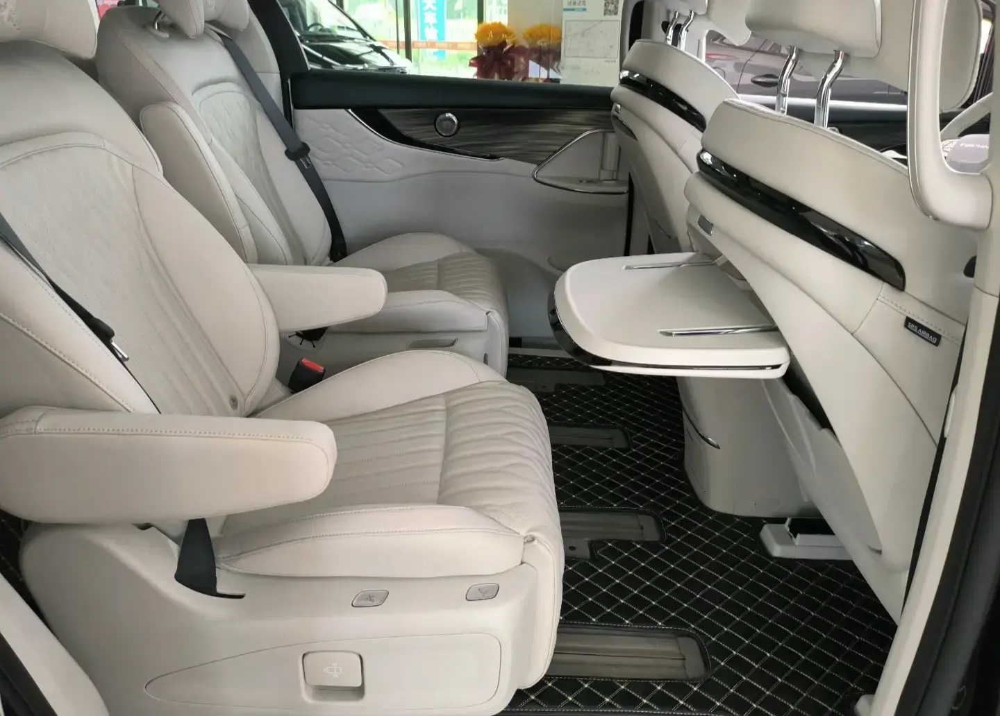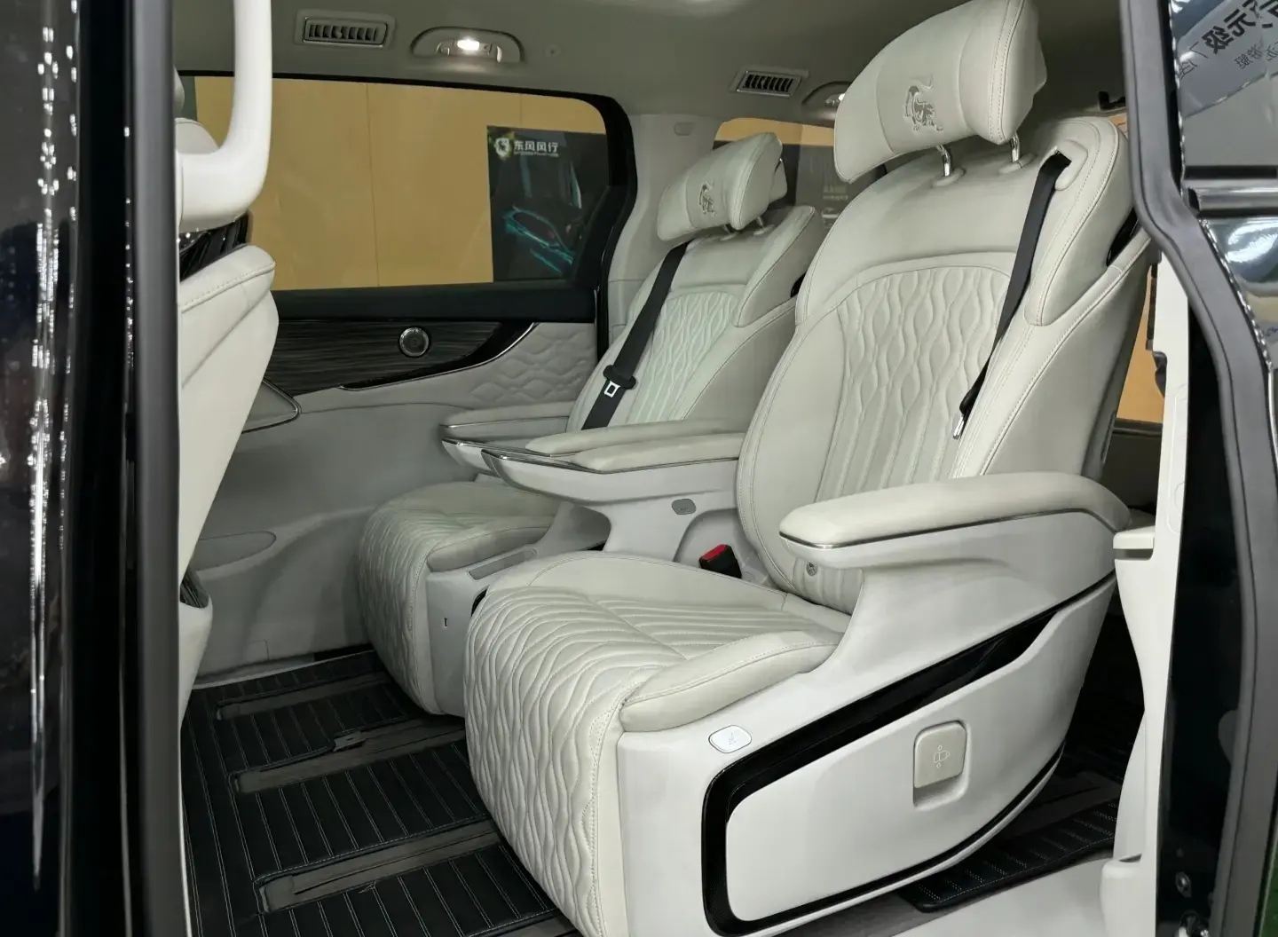 除此之外,例如精致的電子檔桿,大面積開放式的儲物格杯架手機無線充電面板,運動的平底方向盤等細節都不會太大變化,撞色內飾也提供了更加豐富的選擇,驍龍8155車機芯片L2+級輔助系統都在高配得到了配置。當然對于一款高端商務MPV第2排才是最關鍵的表現,無論是高低配都設計了中央岔開通道的雙獨立座椅,區別只是內側扶手高配車型有著獨立的觸摸屏用來控制通風加熱按摩座椅調節等多種配置,提供了更加舒適的體驗。