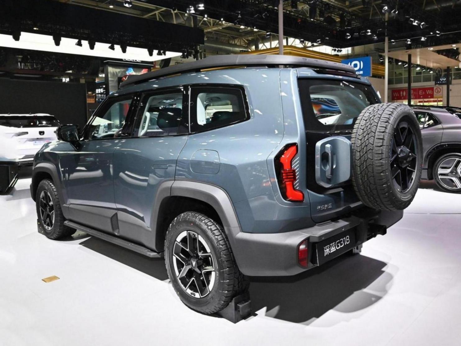 大尺寸輪轂,AT胎等元素不會缺席,車頂還有著厚實的行李架,增強了硬派感。在車尾部分,全尺寸的備胎顯示了硬派的基因,鑲嵌于懸浮式的后備箱設計,令人眼前一亮,C字形的紅色尾燈不算高調,后保險杠部分有著燈組與之對應,整體還是走相對簡潔的設計,較大的離去角也提供了不錯的通過性能。