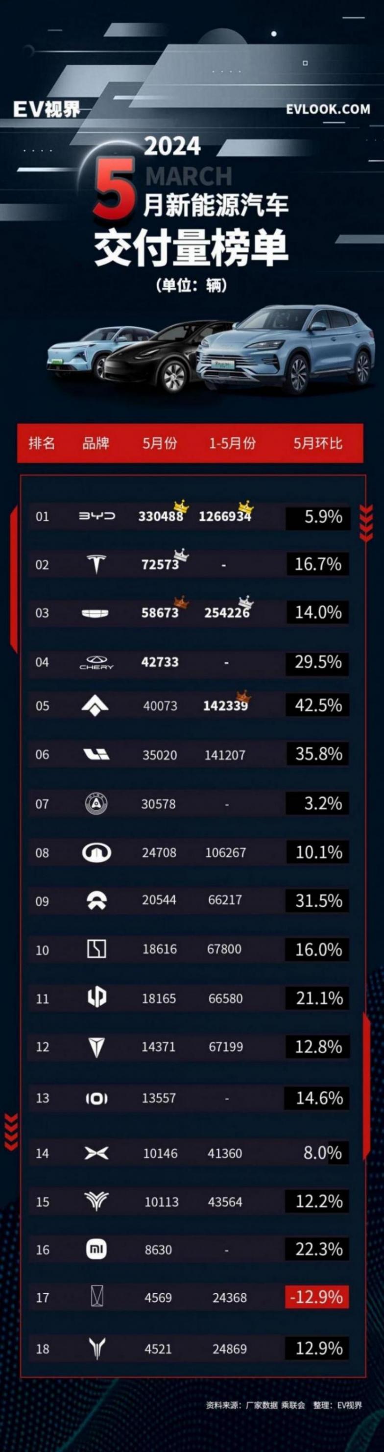 5月新能源汽車市場,比亞迪以超33萬輛的銷量繼續(xù)領跑,奇瑞堅持內(nèi)銷+出口的戰(zhàn)略,銷量表現(xiàn)亮眼;埃安、理想汽車和鴻蒙智行都突破3萬輛大關;蔚來和極氪刷新了月度交付紀錄,小鵬汽車和哪吒汽車重返“萬輛俱樂部”。新勢力車企和傳統(tǒng)自主品牌正面PK仍在繼續(xù),而且競爭越來越激烈。6月新能源市場將會有怎樣的發(fā)展,讓我們拭目以待吧。