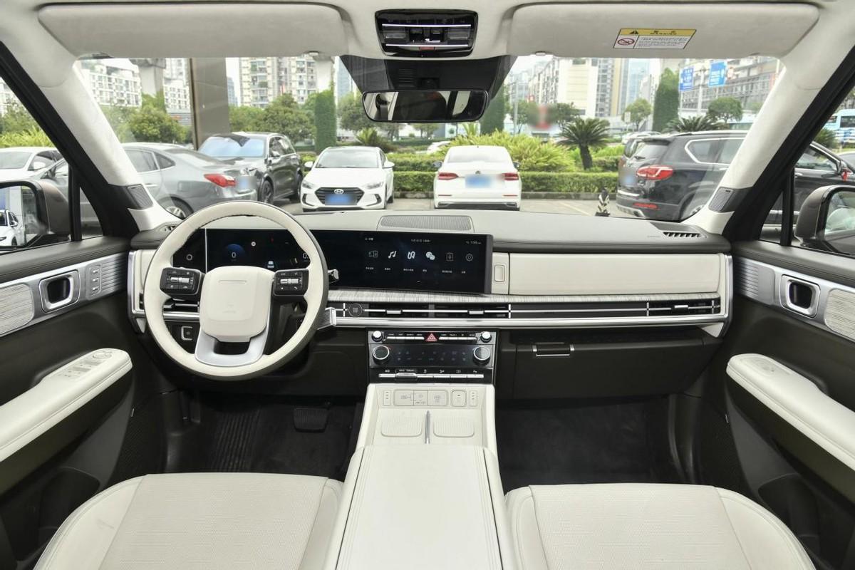 新車采用三輻式的方向盤,新車的副駕駛一側采用的是很有質感的面板裝飾,內飾豪華感很足。全系標配30英寸曲面屏和懷擋式換擋機構以及 121 色氛圍燈,搭載高通驍龍8155 芯片,極具科技感。